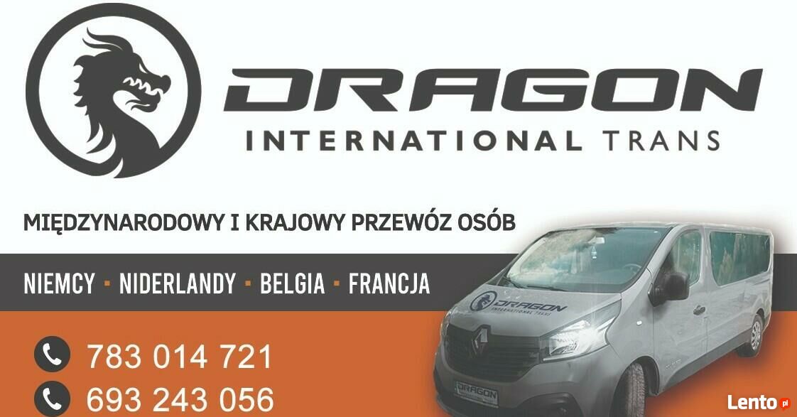 Firma Dragon International-Trans świadczy usługi w postaci przewozu osób, transportu paczek a także korespondencji na terenie kraju jak i za granicą ( Niemcy, Holandia,Belgia, Francja). Uzupełnieniem naszej oferty jest transport wycieczek , zorganizowanych grup osób na wesela, lotniska, szkolenia,inne imprezy okolicznościowe a także przewóz osób niepełnosprawnych.W skład taboru wchodzą busy 9-cio osobowe.Oferujemy również wynajem pojazdów z kierowcą bądź istnieje możliwość ich wypożyczenia.Zapraszamy do skorzystania z naszych usług!www.dragon-przewozy.plSprawdź zainteresowanie tym ogłoszeniem